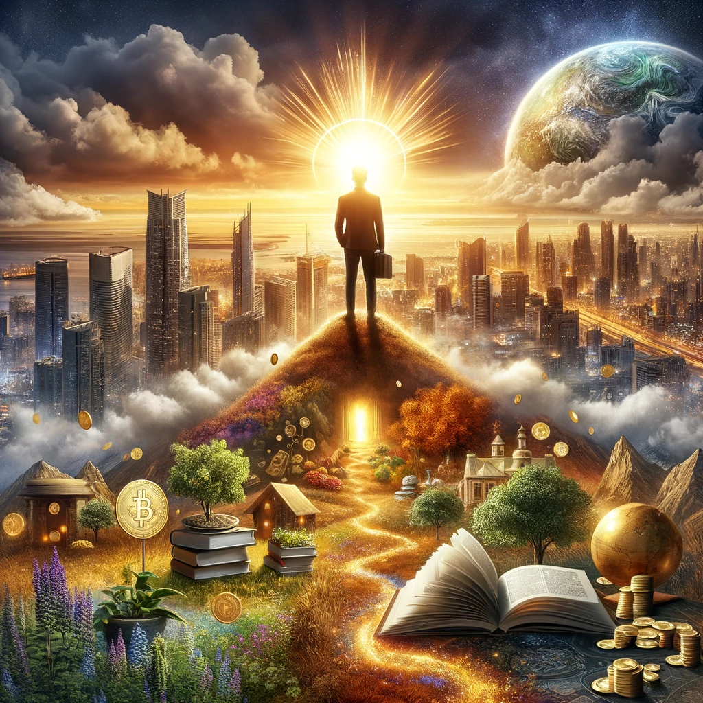 DALL·E 2024-02-06 10.48.56 – Imagine a visually striking scene where the power of a focused and clear mind is symbolized by a person standing on a peak, overlooking a panoramic vi