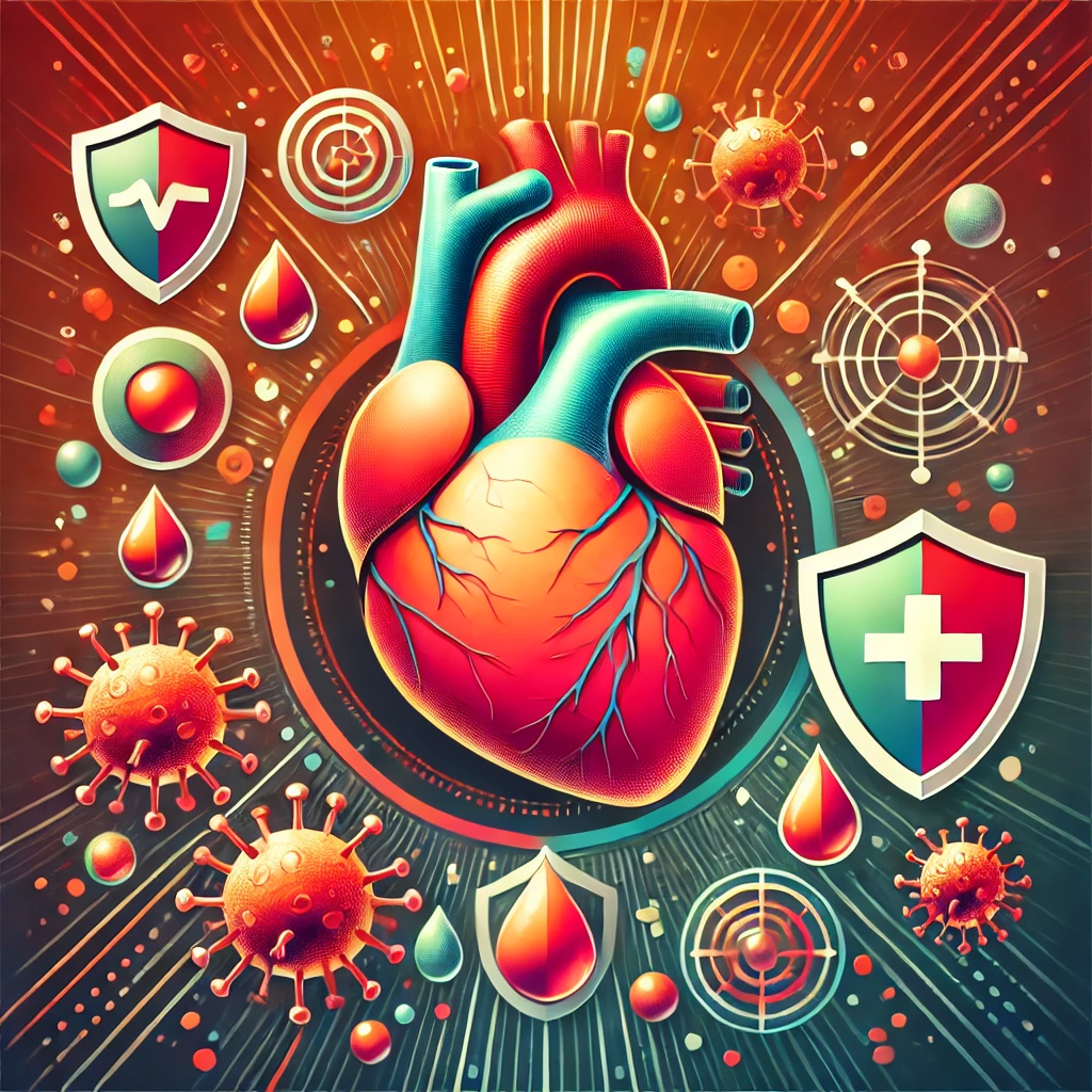DALL·E 2024-10-14 12.25.37 – A graphic representation of a strong heart and elements supporting the immune system. The heart should appear vibrant and healthy, surrounded by symbo
