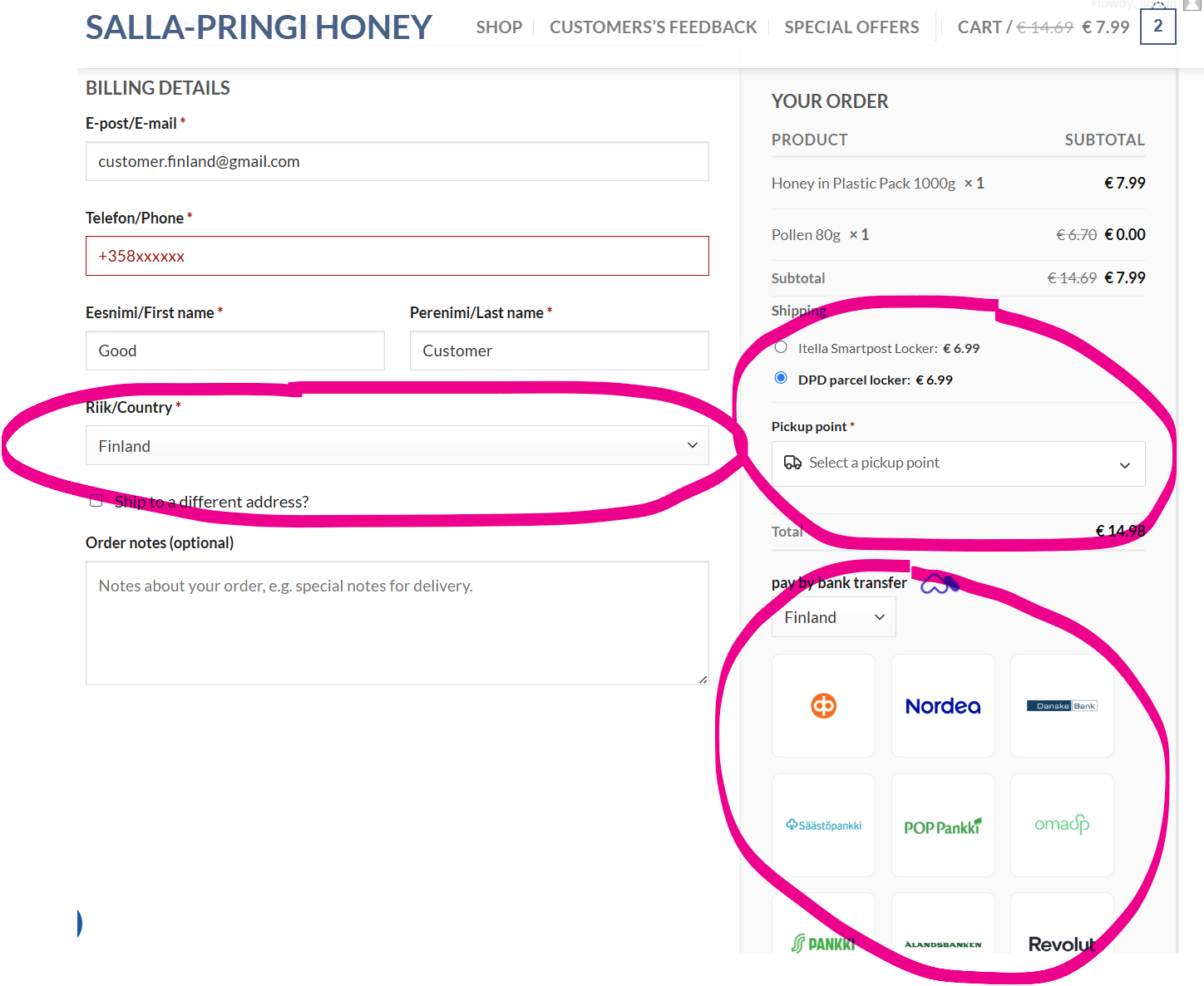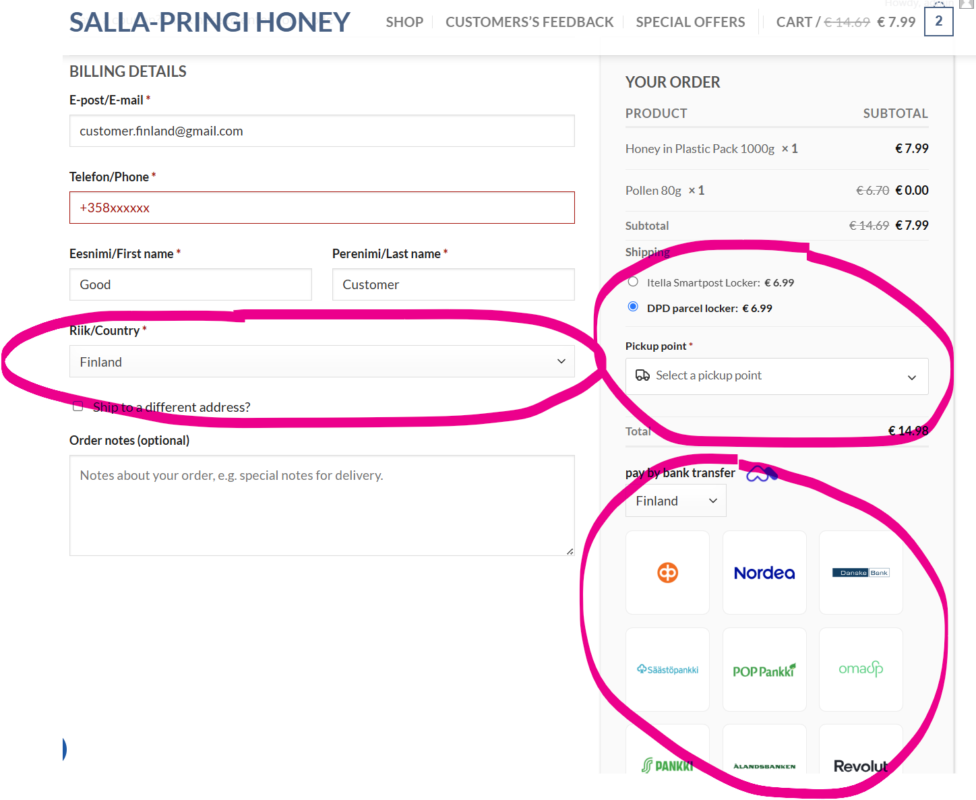 You can pay immediately with a bank link by choosing a suitable bank (OP, Nordea, Danske Bank, Säästopankki, POP Pankki, S-Pankki, Alandsbanken). When paying with a bank link, be sure to click the “Return to merchant” button in the bank after making the payment so that information about the payment reaches our system automatically.