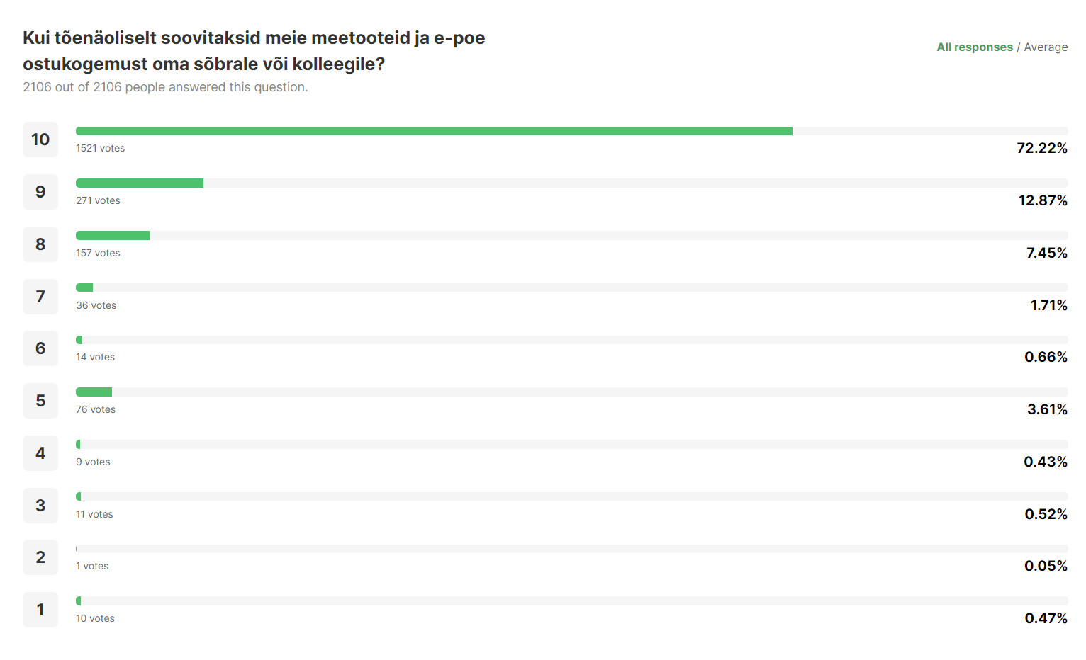 “Kui tõenäoliselt soovitaksid meie meetooteid ja e-poe ostukogemust oma sõbrale või kolleegile? ”  Skaalal hinne 10 – (soovitan väga) ;  hinne 1 (ei soovita üldse)