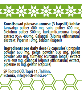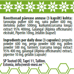 Koostisosad päevase annuse (3 kapslit) kohta: taruvaigu pulber 600 mg, suira pulber 600 mg, õietolmu pulber 500mg, kurkumi(curcuma longa) extract 95% 400mg, Galangal (Alpinia officinarum) ekstrakt 350mg, Piperiin 10mg, želatiin (kapsel)
