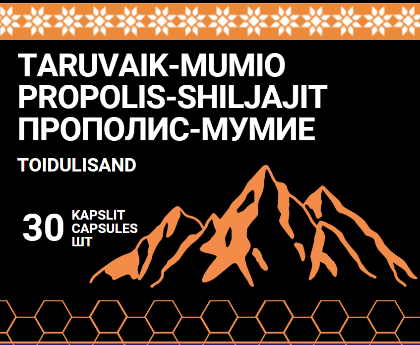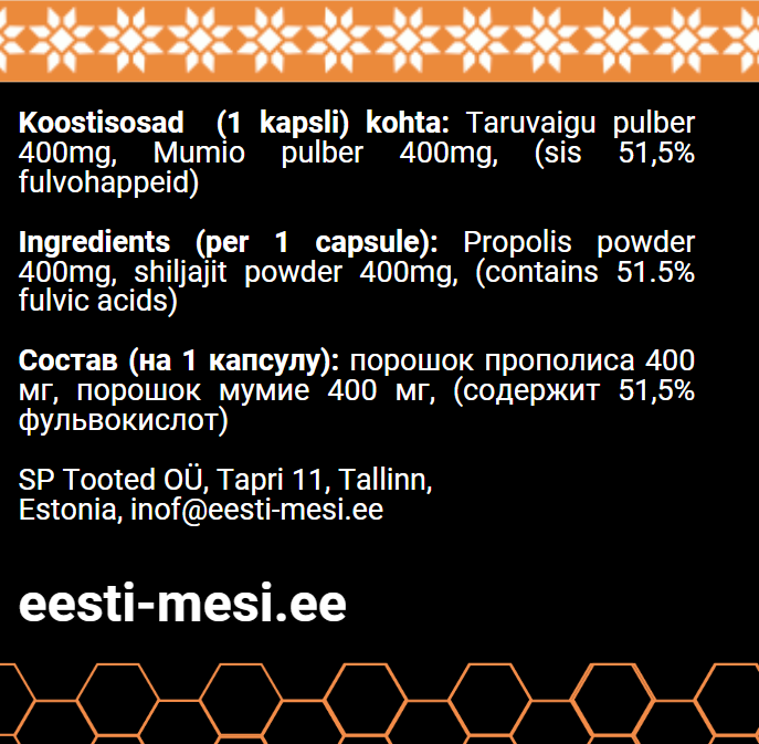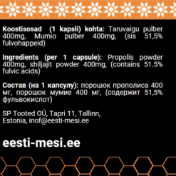 Koostisosad (1 kapsli) kohta: Taruvaigu pulber 400mg, Mumio pulber 400mg, (sis 51,5% fulvohappeid), kapsli kest (želatiin).