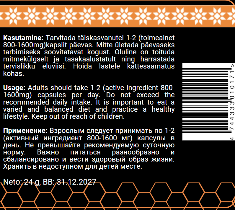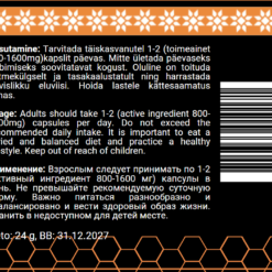Kasutamine: Tarvitada täiskasvanutel 1-2 (toimeainet 800-1600mg)kapslit päevas. Mitte ületada päevaseks tarbimiseks soovitatavat kogust. Oluline on toituda mitmekülgselt ja tasakaalustatult ning harrastada tervislikku eluviisi. Hoida lastele kättesaamatus kohas.