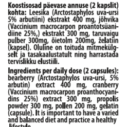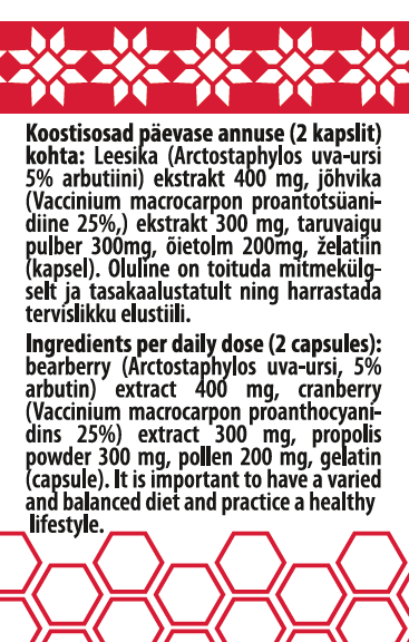 Koostisosad päevase annuse (2 kapslit) kohta: Leesika (Arctostaphylos uva-ursi 5% arbutiini) ekstrakt 400 mg, jõhvika (Vaccinium macrocarpon proantotsüanidiine 25%,) ekstrakt 300 mg, taruvaigu pulber 300mg, õietolm 200mg, želatiin (kapsel)